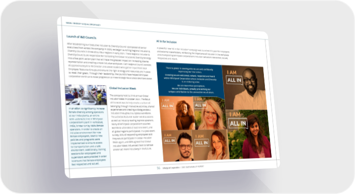 SOCIAL / DIVERSITY & EQUAL OPPORTUNITY Launch of I&D Councils After establishing our Executive Inclusion & Diversity Council (composed of senior executives from across the company) in 2020, we began launching Regional Inclusion & Diversity Councils in three of our four regions in early 2021. These Regional Inclusion & Diversity Councils are responsible for translating the Global Inclusion & Diversity Strategy into a five-point action plan that will have the greatest impact on increasing diverse representation and creating a more inclusive workplace. Each Regional Council consists of approximately 8 to 10 Director and above leaders who gather input from local Employee Resource Groups and ensure the right strategy and resources are in place to meet their goals. Through their leadership, the Councils have helped Whirlpool Corporation continue to make progress on all three strategic focus areas described above. Global Inclusion Week The company held its third annual Global Inclusion Week in October 2021. The focus of the week was to help create a culture of belonging through interactive activities, shared experiences and creating a dialogue about inclusion throughout our global workforce. The activities featured leader-led discussions as well as industry-leading keynote speakers. Many of Whirlpool Corporation’s salaried workforce attended at least one event, and all global regions participated. In a post-event survey, 94% of responding employees said they would participate in Global Inclusion Week again, and 88% agreed that Global Inclusion Week influenced them to behave and/or act more inclusively in the future. In an effort to significantly increase female diversity among operators at our India plants, an entire semi-automatic line in Whirlpool Corporation’s plant in Faridabad, India, is now run by 100% female operators. In order to create an inclusive environment for new female employees, several new policies and programs were implemented to ensure access to transportation and a safe environment. Additionally, training sessions for employees and supervisors were provided in order to ensure that female employees feel respected and valued. All In for Inclusion A powerful new “All In for Inclusion” campaign was launched this year for employees and external stakeholders, reinforcing the importance of inclusion in the workplace and championing Whirlpool Corporation’s inclusion behaviors: Welcomed, Valued, Respected and Heard. There is power in owning who we are and confidently expressing our true selves. Knowing we are welcomed, valued, respected and heard within Whirlpool Corporation where Inclusion and Diversity is an enduring value. We are more than perceptions. We are individuals, proudly proclaiming our unique contribution to the connection we all share. Whirlpool Corporation / 2021 SUSTAINABILITY REPORT 56