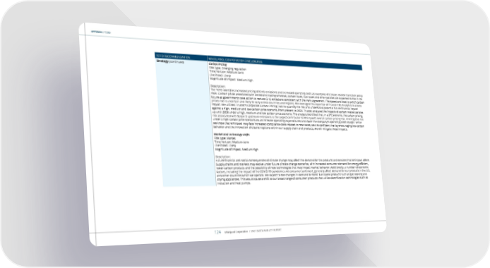APPENDIX / TCFD TCFD RECOMMENDATION WHIRLPOOL CORPORATION DISCLOSURES Strategy (continued) Carbon Pricing Risk type: Emerging regulation Time horizon: Medium-term Likelihood: Likely Magnitude of impact: Medium-high Description: The TCFD identifies increased pricing of GHG emissions and increased operating costs as examples of climate-related transition policy risks. Carbon prices associated with emissions trading schemes, carbon taxes, fuel taxes and other policies are expected to rise in the future as governments take action to reduce GHG emissions consistent with the Paris Agreement. The speed and level to which carbon prices rise is uncertain and likely to vary across countries and regions. We leveraged the expertise of Trucost ESG Analytics to assess impact. We utilized Trucost’s Corporate Carbon Pricing Tool to quantify the risk and understand potential future financial impact against a high, medium and low carbon price scenario, from present to 2050. Trucost analyzed the impacts of carbon-related policies up until 2050 under a high, medium and low carbon price scenario. The analysis identified that, in a 2°C scenario, the carbon pricing risk associated with Scope 3 upstream emissions is the largest contributor to Whirlpool’s overall carbon pricing risk. Unmitigated risk under a high carbon price scenario could increase operating expenditures and lower the company’s operating profit margin. While we know that Whirlpool may face increased compliance costs related to new taxes, we are confident that by encouraging low-carbon behavior and the innovation of cleaner options within our supply chain and products, we will mitigate these impacts. Market and Technology Shifts Risk type: Market Time horizon: Medium-term Likelihood: Likely Magnitude of impact: Medium-high Description: Future financial and social consequences of climate change may affect the demand for the products and services that Whirlpool offers. Supply chains and markets may evolve under future climate change scenarios, with increased consumer demand for energy-efficient, lower-carbon products and the possibility of new technologies that may impact market behavior. Additionally, a number of economic factors, including the impact of the COVID-19 pandemic and consumer sentiment, generally affect demand for our products in the U.S. and other countries which we operate. We expect to see changes in demand for fossil fuel-based products such as gas cooking and drying appliances. This would cause a shift to our broad range of consumer products that utilize electrification technologies such as induction and heat pumps. Whirlpool Corporation / 2021 SUSTAINABILITY REPORT 124