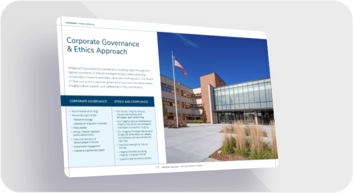 GOVERNANCE / OUR ESG APPROACH Corporate Governance & Ethics Approach Whirlpool Corporation is committed to creating value through the highest standards of ethical and legal conduct while operating sustainably to create shareholder value over the long-term. Our Board of Directors, sound corporate governance structure and values-driven integrity culture support us in delivering on this commitment. • Board Review of Strategy • Board Oversight of ESG - Review of strategy - Updates on long-term initiatives • Proxy Access • Annual Director Elections Board Refreshment • Executive Sessions of Nonemployee Directors • Shareholder Engagement • Diverse & Experienced Board • Our Values: Integrity, Respect, Inclusion & Diversity, One Whirlpool, Spirit of Winning • Our Integrity Manual translates our integrity into action and empowers employees to lead with integrity • Our Integrity Principles: We do what is right for consumers, our people, our company and do business the right way • Executive Oversight & Tone at the Top • Integrity Channels including Integrity Line global hotline • Supplier Code of Conduct (SCoC) ETHICS AND COMPLIANCE CORPORATE GOVERNANCE Whirlpool Corporation / 2021 SUSTAINABILITY REPORT 75