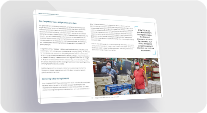 SOCIAL / OCCUPATIONAL HEALTH & SAFETY Core Competency Teams & High Consequence Work Our global EHS Core Competency Teams (CCT), comprised of regional and global subject matter experts, continue to enable best practice sharing and optimization of workstreams. Among them is the Safety CCT, consisting of cross functional representatives from Engineering, Operations and EHS, who partner t o implement approaches and tools to prevent incidents and injuries associated with high-consequence work. Our approach to machine safeguarding focuses on our existing machines and equipment that are assessed as high priority followed by a risk reduction process that includes remediation. For newly acquired machines and equipment, we’re enhancing our machinery safety-related Early Equipment Management (EEM) process to be globally deployed. In alignment with our “We Care” EHS Policy and Standards Manual, the Safety CCT is expanding our Latin America region “ Attitudes for Life ” campaign globally. The Attitudes for Life establish and communicate vital guiding behaviors that can save lives when performing high-consequence work such as working at heights, in a confined space or on live electrical energy. These foundational non-negotiable precautions are brought to life by the conscious choices workers make each day and reinforce the “We Care” EHS policies and procedures while elevating employee awareness regarding activities with a high-potential severity outcome. Additionally, we continue to secure and maintain outside recognition for EHS Management System implementation with 78% of our manufacturing plants globally certified in ISO 45001. Maintaining Safety During COVID-19 Since the global COVID-19 pandemic began, the health and safety of our employees has remained our top priority. While 2020 was a year of development and implementation of policies and procedures related to the pandemic, 2021 efforts pivoted into change management, enforcement and continual improvement. Our global EHS teams have continued to play a central role in our efforts to continue operating safely by implementing COVID-related safety protocols, enforcing the use of masks and social distancing, managing COVID-specific audit processes and responding quickly to evolving guidance, benchmarking and practical learnings. C orporate efforts to encourage employee vaccination included a steady stream of employee information and communications, on-site vaccination events held at Whirlpool Corporation facilities globally and monetary incentives for employees who got vaccinated. These significant efforts proved to be effective in a significant percentage of our employees globally getting vaccinated in 2021. Since the onset of the pandemic, and continuing through 2021, we have continued to actively monitor the pandemic through a cross-functional Global COVID-19 Task Force, which meets weekly to assess the latest developments, make policy and procedural decisions and manage changes in our facilities. While 2020 was a year of development and implementation of policies and procedures related to the pandemic, 2021 efforts pivoted into change management, education and continual improvement. Whirlpool Corporation / 2021 SUSTAINABILITY REPORT 47