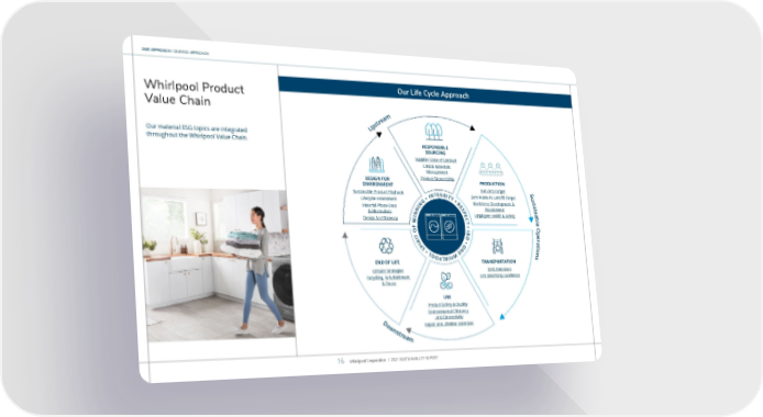 OUR APPROACH / OUR ESG APPROACH Whirlpool Product Value Chain Our material ESG topics are integrated throughout the Whirlpool Value Chain. Our Life Cycle Approach DESIGN FOR ENVIRONMENT Sustainable Product Playbook Lifecycle Assessment Material Phase-Outs & Alternatives Design for Efficiency RESPONSIBLE SOURCING Supplier Code of Conduct Critical Materials Management Product Stewardship PRODUCTION Net Zero Target Zero Waste to Landfill Target Workforce Development & Engagement Employee Health & Safety TRANSPORTATION GHG Emissions EPA SmartWay Excellence USE Product Safety & Quality Environmental Efficiency and Connectivity Repair and Lifetime Extension END OF LIFE C ircular Strategies Recycling, Refurbishment & Reuse D o w n s t r e a m U p s t r e a m S u s t a i n a b l e O p e r a t i o n s I N T E G R I T Y • R E S P E C T • I & D • O N E W H I R L P O O L • S P I R I T O F W I N N I N G • Whirlpool Corporation / 2021 SUSTAINABILITY REPORT 16