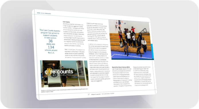 SOCIAL / LOCAL COMMUNITIES 1 Based on a 2019 Braun Research survey conducted by phone within the United S tates among 600 public school teachers (18 years or older) The Care Counts laundry program has grown to support students in need across 36 states and 134 schools around the U.S. Boys & Girls Clubs of America (BGCA) Over the past decade, Boys & Girls Clubs of America and Maytag have presented 114 exceptional Boys & Girls Clubs mentors with a Maytag Dependable Leader Award and $20,000 grant to create or expand youth programs. Maytag plays an intricate part in making sure Boys & Girls Clubs members have opportunities to explore their passions. Throughout the partnership, Maytag has provided nearly $9.5 million to help deserving youth reach their full potential as productive, caring, responsible citizens. Almost 6,000 Whirlpool Corporation employees have volunteered their time at various Clubs across the U.S. Together, Boys & Girls Clubs of America and Maytag celebrate dependability—a quality that is at the core of what the Clubs do every day and is central to the Maytag brand. Care Counts According to teachers nationwide, one in five 1 students struggles with access to clean clothes. The stigma and shame of not having clean clothes can lead students to miss school, and students who miss school are seven times more likely to drop out. The Care Counts laundry program by Whirlpool brand is committed to helping remove one small but important barrier to attendance— access to clean clothes—by installing washers and dryers in schools. Now in its sixth year, the program has expanded to 134 schools in 36 states across the country and is providing access to clean clothes to thousands of students. The Care Counts™ laundry program by Whirlpool brand has expanded its presence to 16 new schools across five new states in the 2021-2022 school year: Idaho, New Jersey, New Mexico, Oklahoma and South Carolina. It will continue to work with schools that are participating in a second year of the program in five regions: Alabama, Arkansas, District of Columbia, Kentucky and Massachusetts. In addition to the program’s introduction into the five new states, Whirlpool brand recently announced an arrangement with Benton Harbor Area Schools to bring the program to the company’s hometown. A first in the history of the Care Counts™ laundry program, the expansion to Benton Harbor is an effort to help maximize K-12 attendance and support education equality in the Benton Harbor community. Working hand-in-hand with the Benton Harbor Area School Board and superintendent, Whirlpool brand installed washers and dryers in every school within the district and developed a customized program to collect anonymized data to study the impact that the program made on student attendance, grades, graduation rates and engagement. Whirlpool Corporation / 2021 SUSTAINABILITY REPORT 67