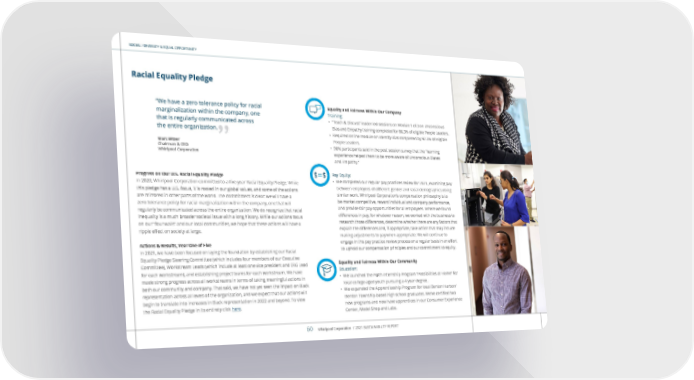 SOCIAL / DIVERSITY & EQUAL OPPORTUNITY Progress on Our U.S. Racial Equality Pledge In 2020, Whirlpool Corporation committed to a five-year Racial Equality Pledge. While this pledge has a U.S. focus, it is rooted in our global values, and some of the actions are mirrored in other parts of the world. The commitment is clear: we will have a zero tolerance policy for racial marginalization within the company, one that will regularly be communicated across the entire organization. We do recognize that racial inequality is a much broader societal issue with a long history. While our actions focus on our “four walls” and our local communities, we hope that these actions will have a ripple effect on society at large. Actions & Results, Year One of Five In 2021, we have been focused on laying the foundation by establishing our Racial Equality Pledge Steering Committee (which includes four members of our Executive Committee), Workstream Leads (which include at least one vice president and ERG Lead for each workstream), and establishing project teams for each workstream. We have made strong progress across all workstreams in terms of taking meaningful actions in both our community and company. That said, we have not yet seen the impact on Black representation across all levels of the organization, and we expect that our actions will begin to translate into increases in Black representation in 2022 and beyond. To view the Racial Equality Pledge in its entirety click here . Equality and Fairness Within Our Company Training: • “Teach & Discuss” leader-led sessions on Module 1 of 3 on Unconscious Bias and Empathy training completed for 86.3% of eligible People Leaders. • Required online module on Identify Bias completed by 92.3% of eligible People Leaders. • 90% participants said in the post session survey that the “learning experience helped them to be more aware of Unconscious Biases and Empathy.” Pay Equity: • We completed our regular pay practices review for 2021, examining pay between employees of different gender and racial demographics doing similar work. Whirlpool Corporation’s compensation philosophy is to be market competitive, reward individual and company performance, and provide fair pay opportunities for all employees. Where we found differences in pay, for whatever reason, we worked with the business to research those differences, determine whether there are any factors that explain the differences and, if appropriate, take action that may include making adjustments to pay when appropriate. We will continue to engage in this pay practice review process on a regular basis in an effort to uphold our compensation principles and our commitment to equity. Equality and Fairness Within Our Community Education: • We launched the P@th Internship Program “Possibilities at Home” for local college-aged youth pursuing a 4 year degree. • We expanded the Apprenticeship Program for local Benton Harbor/ Benton Township-based high school graduates. We’ve certified two new programs and now have apprentices in our Consumer Experience Center, Model Shop and Labs. ” “We have a zero tolerance policy for racial marginalization within the company, one that is regularly communicated across the entire organization. Marc Bitzer Chairman & CEO Whirlpool Corporation Racial Equality Pledge Whirlpool Corporation / 2021 SUSTAINABILITY REPORT 60