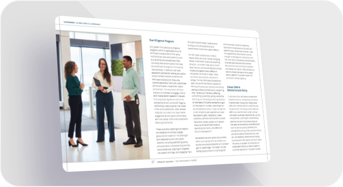 GOVERNANCE / GLOBAL ETHICS & COMPLIANCE Due Diligence Program Our global third-party due diligence program, which is applicable to all of Whirlpool Corporation’s third-party relationships, evaluates potential and future ethics and compliance risks, including risks of corruption that may be presented through our third-party relationships. In addition, we have escalation policies for raising corruption and/or bribery matters to either the Whirlpool Corporation Executive Committee and/or the Audit Committee of the Whirlpool Corporation Board of Directors. The escalation of these matters is intended to engage, inform and involve senior leaders in matters that may pose significant risk to the company and our culture of integrity. Additionally, every quarter the Global Ethics and Compliance Team reviews Integrity Line cases that may involve allegations of corruption and bribery with the Global Ethics and Compliance Steering Committee. These quarterly meetings and reports are designed to actively engage global senior leaders in the oversight and response to anti-corruption matters, including addressing policy enhancements, implementing controls and procedures, aligning on targeted risk-based trainings, and engaging input on sustaining Whirlpool Corporation’s strong culture of compliance and commitment to anti-corruption efforts. For Whirlpool Corporation, bribery means more than just money changing hands. If the intent is corrupt, anything of value—no matter how small and of what nature—can be considered a bribe. Bribery of a government official or any person or entity is illegal. Many countries also prohibit commercial bribes. Further, Whirlpool Corporation does not permit facilitation payments. Whirlpool Corporation policies proactively address bribery and facilitation, explaining that, “directly or indirectly offering, authorizing, promising, giving, accepting, soliciting, or receiving something of value to improperly influence someone or gain an improper or unlawful advantage can be considered a bribe. It may include but is not limited to cash payments or cash equivalents, gifts, hospitality, travel, vacations, political contributions and/or donations, meals, access to or special status at entertainment events, awarding contracts, and offers of future employment.” We believe that corruption occurs when there is an abuse of trust and/or our values are compromised for an improper gain or advantage. This might include falsifying documents in exchange for (or to conceal) a bribe or receiving some form of personal enrichment for performing a normal job function. Even the appearance of corruption can be enough to damage our reputation and the trust of our customers, shareholders, business partners and one another. We maintain strict controls to prevent and detect corruption. We consistently communicate that we all must apply good judgment to prevent even the perception of wrongdoing. Global Gifts & Entertainment Policy In January 2020, Whirlpool Corporation implemented our revised Global Gifts & Entertainment Policy (the “Policy”) and Gifts and Entertainment Guidelines (the “Guidelines”). The Policy and Guidelines affirm our commitment to fair, ethical and lawful business relationships. As the Policy states, “[Whirlpool Corporation] awards and earns business solely on the basis of commercial considerations such as value, quality, services and competitive pricing. Gifts, entertainment, and other special favors are not, and will not become, conditions for doing business with Whirlpool and shall never influence, or appear to influence, an employee’s ability to make impartial business decisions in the best interest Whirlpool Corporation / 2021 SUSTAINABILITY REPORT 87