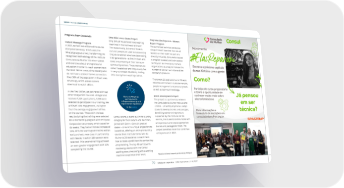 SOCIAL / LOCAL COMMUNITIES Programs from Consulado Instant Message Program In 2021, we held two editions of the course #Empreendenozap, which uses the WhatsApp app as a tool, transforming the recognized methodology of the Instituto Consulado da Mulher into short videos and exercises about entrepreneurial education in order to reach women from the most distant areas of the country who do not have a stable internet connection. Over 50% of the population in Brazil uses WhatsApp, which allows content download to watch offline. In the First Edition, we partnered with two other companies: Itaú and Ultragaz and received 1,325 applications, 1,056 were selected to participate in our training. We achieved 30% engagement, 7% higher than the average engagement of free online courses. Those with the best results during the training were selected for a mentorship program with Whirlpool Corporation volunteers, which lasted for six weeks. They had an income increase of 59%. With the learnings of this first edition we launched a new class in partnership with Nestlé, in which 389 women were selected. This second training achieved an even greater engagement with 53% completing the course. Uma Mão Lava a Outra Project Only 34% of households have washing machines in the northeast of Brazil. 1 The reasons vary, but one of them is cultural: people are used to outsourcing this job to women who have been doing it for generations—at first in rivers and lakes and presently at their homes or community centers. These women are called “lavadeiras” and they usually live in very vulnerable situations, making little money from washing clothes. Programa Elas Reparam—Women Repair Program The authorized technical assistance shops in Brazil have less than 5% of women on their staff. 1 As part of a diversity initiative, Consulado created a program to select and train women so they can be hired by our service organization, as a way to increase the number of women technicians of the company’s products. There were 35 applications and 10 were selected and trained in customer service, people management and personal growth, as well as technical knowledge. Brand Development Project This project is a partnership between the Consulado da Mulher Institute and Univille—University of Joinville. Design students develop brands and packages, benefiting women entrepreneurs supported by the Institute. For six months, the students communicate with entrepreneurs and create appropriate brands and packages for them. The project benefited more than 30 female entrepreneurs in 2021. Maria do Perpétuo participated in #Empreendenozap and reported her experience in the video . Consul brand, a stand-out in the laundry category for their easy-to-use machines, joined with Zenir—Consul’s product dealer—to launch a unique project for the lavadeiras, offering an entrepreneurship course from Instituto Consulado da Mulher to 20 lavadeiras to teach them how to make a profit from the service they are providing. The top 10 participants received guidance with the Consul washing executives along with a washing machine to optimize their work. 1 Based on internal research performed by Whirlpool. Whirlpool Corporation / 2021 SUSTAINABILITY REPORT 70