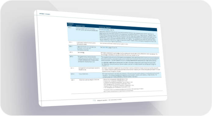 APPENDIX / GRI INDEX Disclosure Number Disclosure Name Current-Year Response 205-2 Communication and training about anti-corruption policies and procedures See Anti-Corruption , page 86. 100% of our Board of Directors and Executive Committee members have received communication regarding the organization’s anti-corruption policies and procedures, including Whirlpool’s Our Integrity Manual. In addition, 100% of Whirlpool's Executive Committee, and numerous other Whirlpool senior leaders, participated in Whirlpool's annual Integrity Week trainings, where they participated in training and/or messaging on the importance of Whirlpool's commitment to anti-corrptuon practices, policies, and integrity. The members of the Executive Committee reflect senior leadership in each of our regional operations. Senior Leaders reflect employees ranging from Director and above in each of our regional operations. 205-3 Confirmed incidents of corruption and actions taken We had zero confirmed incidents of corruption in 2021. 206-1 Legal actions for anti-competitive behavior, anti-trust and monopoly practices See Form 10-K , pages 77 and 79. 207-1 Tax strategy Whirlpool Corporation's tax strategy is to fully comply with the tax laws in the jurisdictions in which we operate. This tax strategy is reviewed annually by the CEO, CFO, and Vice-President of Tax. 207-2 Tax governance, mechanisms for reporting concerns about unethical or unlawful behavior and the assurance process for disclosures on tax The tax governance and control framework are embedded in Whirlpool Corporation’s internal controls and compliance with these controls is assessed through routine reviews by the Company's Internal Audit function and independent external auditors. The Vice-President of Tax is ultimately responsible for compliance with these internal controls. Our approach regarding tax disclosures is included in Whirlpool Corporation’s public filings, which are audited by independent external auditors. Concerns about unethical or unlawful behavior can be reported through our Integrity Line. 207-3 Management of stakeholder concerns related to tax Whirlpool Corporation engages with tax authorities in various jurisdictions through routine tax inquiries and audits. Our Investor Relations team collects comments from external investors, and internal employees participate in multiple questionnaires throughout the year. 207-4 Tax jurisdictions Whirlpool Corporation manufactures products in 12 countries and markets products in nearly every country around the world. The Company’s geographic segments consist of North America, Latin America, Europe and Asia. The Company pays tax in every profitable jurisdiction where it has nexus. 301-1 Materials used by weight or volume • Metals (non-renewable): 2,062,600 Metric Tons • Plastics (non-renewable): 559,600 Metric Tons • Cardboard Packaging (renewable)*: 120,132 Metric Tons • EPS Packaging (non-renewable): 45,893 Metric Tons • Recycled Paper Packaging (renewable): 17,838 Metric Tons • Film Packaging (non-renewable): 9,356 Metric Tons *The recycled content in our cardboard packaging varies from 25% to 100%, depending on the region. Note: This data is estimated based on engineering and sourcing estimates. Whirlpool Corporation / 2021 SUSTAINABILITY REPORT 113