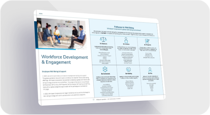 SOCIAL Workforce Development & Engagement Employee Well-Being & Support In 2021, we continued to focus on overall employee well-being and support. The global pandemic has continued to reinforce the need for holistic well-being offerings. Whirlpool Corporation has worked to develop a global and holistic well- being strategy centered around Be*Well. The program focuses on six pathways: Be*Balanced, Be*Curious, Be*Prepared, Be*Connected, Be*Healthy and Be*You. Many of our global programs align to each of the pathways as illustrated on this page. In 2022, Whirlpool Corporation will begin the formal roll-out of the Pathways to Well-Being strategy with continued education and additional programs. Be Balanced. Staying emotionally healthy by balancing home, work and play helps us live a more fulfilling life. Mental/Emotional Health Work/Life Balance Employee Assistance Program Vacation Holidays Personal & Family Leave Agile Work Arrangements Family Support Be Curious. Learning enhances our career development and creates confidence in our lives. Growth shapes our work and life for the better. Learning & Development Education Reimbursement On-the-Job Training/Learning Leadership Development Self Discovery Tools Career Development Leadership Model Internship Program Be Prepared. Planning helps us achieve our short- and long-term financial goals. A simple plan can help us live a more sustainable lifestyle. Financial Health Retirement Plans Disability/Sick Leave Employee Perks & Discounts Pathways to Well-Being Whirlpool Corporation’s global well-being commitment We care about the health and well-being of our employees and their families. We provide holistic support to empower and encourage you to Be*Well in all aspects of improving life at home and work. Together, we can take on whatever life throws at us. Be Connected. Building social and inclusive relationships helps us contribute and communicate. We are better when we can be heard, valued, respected and welcomed. Social Wellness Inclusion & Diversity Employee Resource Groups Community Involvement Employee Recognition Corporate Social Responsibility Length of Service Awards Community Involvement Be Healthy. Meeting our physical health goals by staying fit allows us to live a healthy, happy life. Physical Wellness Exercise & Nutrition Medical & Pharmacy Ancillary Benefits Telemedicine Health Clinic Be You. Being your true self is ultimately your choice. Your journey to self care leads to a genuine, meaningful life that is happier and healthier. Personal Accountability Encourage Empower Motivate Grow Thrive Whirlpool Corporation / 2021 SUSTAINABILITY REPORT 51