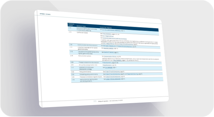 APPENDIX / GRI INDEX Disclosure Number Disclosure Name Current-Year Response 2-14 Role of the highest governance body in sustainability reporting See Our ESG Governance & Leadership , page 12. 2-15 Conflicts of interest See Proxy Statement , pages 2-12, 16. See Our Integrity Manual See Corporate Governance Guidelines and Policies In addition, each year as part of our Annual Certification and Integrity Manual Refresher training, we ask all in-scope employees to certify that they have disclosed any conflicts of interest and have read all applicable Whirlpool policies and Our Integrity Manual . See also Global Ethics & Compliance , page 81 . 2-16 Communication of critical concerns See Whirlpool Integrity Line and Global Ethics & Compliance , page 81 . 2-17 Collective knowledge of the highest governance body See Board of Directors , page 76 . 2-18 Evaluation of the performance of the highest governance body See Board of Directors , page 76 . 2-19 Remuneration policies See Compensation Policies , page 80 . Additional details on our Board of Directors compensation, and our executive compensation policies and programs can be found in our Proxy Statement , pages 21-38, as filed with the SEC. 2-20 Process to determine remuneration Proxy Statement , pages 21-38. 2-21 Annual total compensation ratio Proxy Statement , page 54. 2-22 Statement on sustainable development strategy See CEO Message , page 7 . 2-23 Policy commitments See Global Ethics & Compliance , page 81 . 2-24 Embedding policy commitments See Global Ethics & Compliance , page 81, and Responsible Sourcing , page 93 . 2-25 Processes to remediate negative impacts See Global Ethics & Compliance , page 81 . 2-26 Mechanisms for seeking advice and raising concerns See Global Ethics & Compliance , page 81 . Whirlpool Corporation / 2021 SUSTAINABILITY REPORT 111