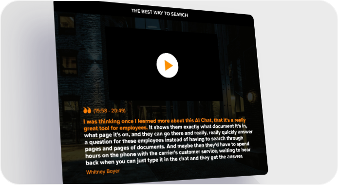 THE BEST WAY TO SEARCH 1. Domestic & General started out over 100 years ago, ensuring cattle and sheep rights. So not long after the Titanic went down there was a need all of a sudden to have protection and insurance on your livestock. (19:58 - 20:49) I was thinking once I learned more about this AI Chat, that it's a really great tool for employees. It shows them exactly what document it's in, what page it's on, and they can go there and really, really quickly answer a question for these employees instead of having to search through pages and pages of documents. And maybe then they'd have to spend hours on the phone with the carrier's customer service, waiting to hear back when you can just type it in the chat and they get the answer. Whitney Boyer