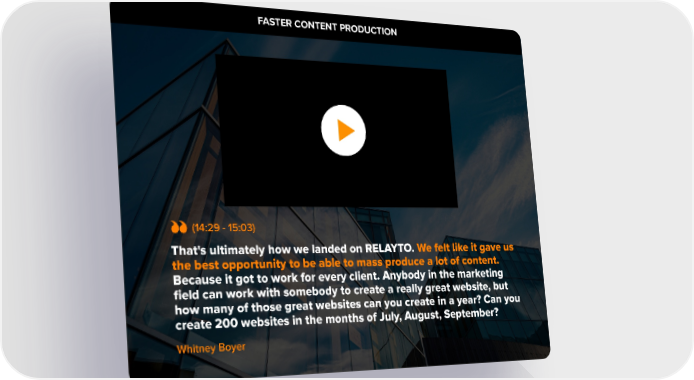 FASTER CONTENT PRODUCTION 1. Domestic & General started out over 100 years ago, ensuring cattle and sheep rights. So not long after the Titanic went down there was a need all of a sudden to have protection and insurance on your livestock. (14:29 - 15:03) That's ultimately how we landed on RELAYTO. We felt like it gave us the best opportunity to be able to mass produce a lot of content. Because it got to work for every client. Anybody in the marketing field can work with somebody to create a really great website, but how many of those great websites can you create in a year? Can you create 200 websites in the months of July, August, September? Whitney Boyer