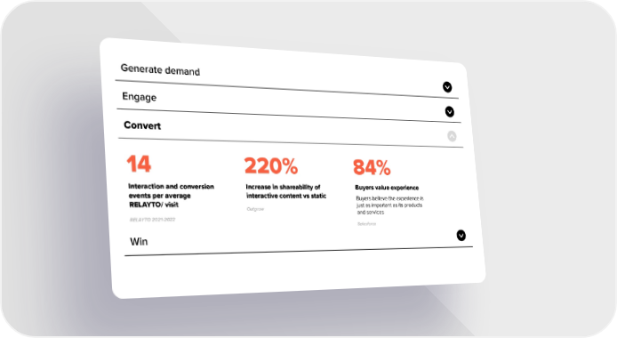 Generate demand Engage Convert 14 220% 84% Interaction and conversion Increase in shareability of Buyers value experience events per average interactive content vs static Buyers believe the experience is RELAYTO/ visit just as important as its products Outgrow and services RELAYTO 2021-2022 Salesforce Win