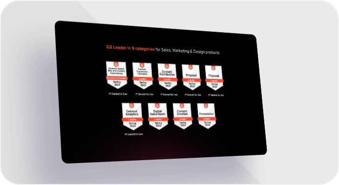 User friendly interface that allows Enhances storytelling in pitching content creation and dynamic visual and makes a lasting impression designs without technical knowledge on customers or prior experience G2 Leader in 9 categories for Sales, Marketing & Design products #1 Easiest to Use #1 Easiest to Use #1 Easiest to Use #1 Easiest to Use #1 Easiest to Use #1 Easiest to Use