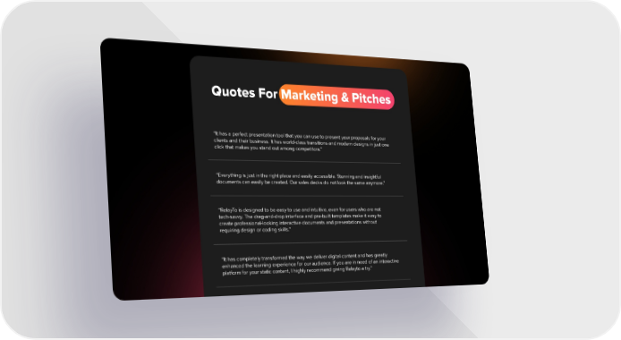 Quotes For Marketing & Pitches “It has a perfect presentation tool that you can use to present your proposals for your clients and their business. It has world-class transitions and modern designs in just one click that makes you stand out among competitors.” “Everything is just in the right place and easily accessible. Stunning and insightful documents can easily be created. Our sales decks do not look the same anymore.” “RelayTo is designed to be easy to use and intuitive, even for users who are not tech-savvy. The drag-and-drop interface and pre-built templates make it easy to create professional-looking interactive documents and presentations without requiring design or coding skills.” “It has completely transformed the way we deliver digital content and has greatly enhanced the learning experience for our audience. If you are in need of an interactive platform for your static content, I highly recommend giving Relayto a try.”