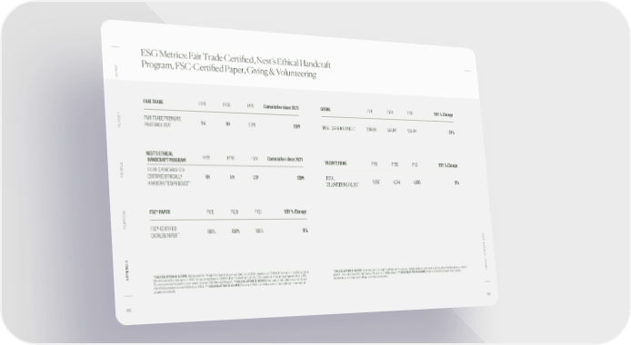ESG Metrics: Fair Trade Certified, Nest’s Ethical Handcraft O Program, FSC-Certified Paper, Giving & Volunteering INTR FAIR TRADE FY19 FY20 FY21 Cumulative since 2021 GIVING FY19 FY20 FY21 YOY % Change FAIR TRADE PREMIUMS NA NA $ 3M $3M * $20.0M $43.6M $34.1M -22% ANET * TOTAL $ GIVEN & RAISED PL PAID SINCE 2021 NEST’S ETHICAL FY19 FY20 FY21 Cumulative since 2021 HANDCRAFT PROGRAM VOLUNTEERING FY19 FY20 FY21 YOY % Change OPLE TOTAL $ PURCHASES OF PE CERTIFIED ETHICALLY NA NA $9M $9M TOTAL 9,997 4,244 4,606 9% ** ** HANDCRAFTED PRODUCT VOLUNTEERING HOURS FSC® PAPER FY19 FY20 FY21 YOY % Change PURPOSE FSC®-CERTIFIED 100% 100% 100% 0% CATALOG PAPER*** T 2021 T REPOR C A APPENDIX *CALCULATION & SCOPE We’ve paid Fair Trade Premiums to our vendors since 2014, paying over $7M in Premiums from 2014-2020. *CALCULATION & SCOPE Contributions through fundraising for causes, miscellaneous community giving, associate donations, shelter IMP We announced a new goal in 2021 to pay an additional $10M in Fair Trade Premiums by 2025 and are measuring progress after 2021. grants, product proceeds, matching gifts and in-kind donations. **CALCULATION & SCOPE Total volunteering hours from global, To view premiums paid in prior years, see our 2020 Impact Report. **CALCULATION & SCOPE Cumulative total dollars paid in Nest corporate associates, excluding non-store associates. Certified products across WSI since 2021. ***CALCULATION & SCOPE Percent of FSC-certified paper in our catalogs in number of pages circulated. 95 96