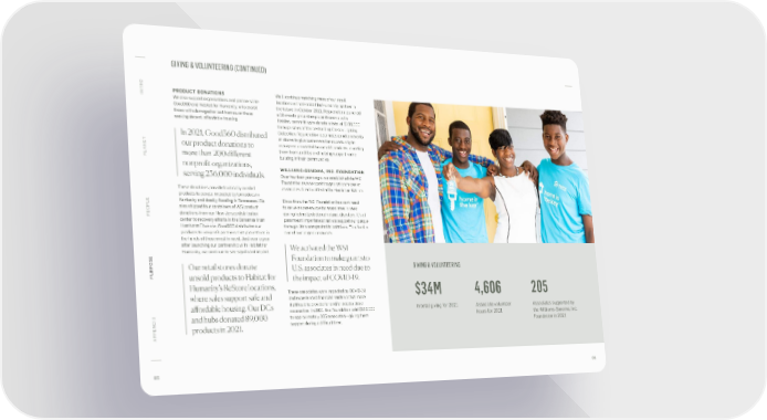 GIVING & VOLUNTEERING (CONTINUED) O INTR PRODUCT DONATIONS We’ll continue matching more of our retail We also support organizations and partners like locations with a Habitat for Humanity partner in Good360 and Habitat for Humanity, who assist the future. In October 2021, Rejuvenation launched those with damaged or lost homes, or those a 16-month philanthropic partnership with seeking decent, affordable housing. Habitat, committing to donate a total of $100,000 through sales of the bestselling Carson Lighting In 2021, Good360 distributed Collection. Rejuvenation also hosts donation events at stores to give customers the opportunity to our product donations to repurpose unwanted household products, diverting ANET more than 200 different them from landfills and helping support home PL building in their communities. nonprofit organizations, WILLIAMS-SONOMA, INC. FOUNDATION serving 236,000 individuals. Over fourteen years ago, we established the WSI Foundation as a nonprofit organization to assist These donations provided critically needed associates directly affected by Hurricane Katrina. products to people impacted by tornadoes in Kentucky and deadly flooding in Tennessee. We Since then, the WSI Foundation has continued OPLE also shipped four containers of WSI product to serve as a resource for associates in need PE donations from our New Jersey distribution during federally declared natural disasters. It’s of center to recovery efforts in the Bahamas from paramount importance that we support our people Hurricane Florence. Good360 distributes our through life’s unexpected tribulations. This fund is products to nonprofit partners that place them in one of our largest resources. the hands of those most in need. Just over a year after launching our partnership with Habitat for We activated the WSI Humanity, we continue to see significant impact. Foundation to make grants to Our retail stores donate U.S. associates in need due to GIVING & VOLUNTEERING PURPOSE unsold products to Habitat for the impact of COVID-19. Humanity’s ReStore locations, These associates were impacted by COVID-19 $34M 4,606 205 where sales support safe and and experienced financial hardship that made T 2021 affordable housing. Our DCs it difficult to provide for and/or access basic In total giving for 2021 Associate volunteer Associates supported by necessities. In 2021, the Foundation paid $156,000 hours for 2021 the Williams-Sonoma, Inc. and hubs donated 89,000 to approximately 205 associates—giving them T REPOR support during a difficult time. Foundation in 2021 C products in 2021. A APPENDIX IMP 85 86