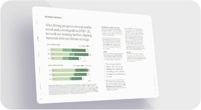 RESPONSIBLE MATERIALS O INTR RESPONSIBLE WOOD & COTTON WSI is committed to only purchasing wood and After driving progress on responsible Building on the progress of our wood and cotton paper obtained from known, legal and responsibly goals, we’re expanding our work to other materials. managed forests with proper chain-of-custody wood and cotton goals in 2020–21, By aligning responsible materials with our climate documentation. Our overall usage of wood (meters 3 strategy, we’re making materials a critical element cubed) grew by 8.6% from 2020 to 2021. The m of our Science-Based Target. volume of FSC-certified wood we purchased, or we took our strategy further, aligning our “Best” category, grew by 7% and the volume We also recognize that responsible materials used in our Better category grew by over 93%. materials with our climate strategy. increasingly impact both environmental and Our overall percentage of Responsibly Sourced ANET social issues. With this framing, we adopted Wood decreased from 64.5% in 2020 to 60% in PL and expanded on Textile Exchange’s Preferred 2021, driven mostly by a drop from “Good” to Fiber and Material Matrix to guide our work “Acceptable” due to stricter classification around 50% RESPONSIBLE WOOD* Good Better Best going forward. We plan to focus first on fibers imported wood under Indonesia’s SVLK timber beyond cotton, expanding to all materials in legality assurance system alongside an increase in the coming years. overall imported wood usage in Indonesia. 2021 20% 16% 24% 60% total WOOD COTTON 65% We exceeded our 50% responsibly sourced wood As of 2021, 94% of our cotton is responsibly OPLE 2020 31% 9% 25% total goal one year early, with over 60% in 2020. As sourced, with a remaining 3% in transition, 2% PE one of our furniture’s largest-volume materials, not going forward and 1% being confirmed. In the 2019 19% 10% 18% 47% responsible wood remains key to preventing coming years, we remain committed to maintaining total deforestation and preserving ecosystems. 100% responsibly sourced cotton across 50% goal Williams-Sonoma, Inc. ** We continue to lead the 100% RESPONSIBLE COTTON Good Better Best In Transition industry, with a Top Scorer 2021 58% 3% 33% 94% 6% ranking on the Sustainable PURPOSE total Furnishings Council’s Wood 2020 54% 4% 31% 89% Furniture Scorecard four years total 75% in a row. 2019 44% 4% 27% total T 2021 100% goal We source an assortment of wood—including FSC®-certified, reclaimed and recycled wood— * in our products. We categorize our wood using a T REPOR CALCULATION & SCOPE Tracked by Sourcemap reporting and SKU-level wood volumes from vendors. FSC® volume verified by Rainforest C Alliance. Percent of responsibly sourced wood in our furniture in cubic meters. Responsibly sourced wood is categorized through a Good- Good-Better-Best approach, along with our Fiber, A Better-Best approach: Best—FSC®-N0002185; Better—Programme for the Endorsement of Forest Certification (PEFC from low-risk countries), Wood and Paper Procurement Policies. These APPENDIX Rediscovered wood (reclaimed/recycled and orchard wood sources), FSC® Controlled Wood; Good—verified legal and low-risk wood for legality IMP ** (as defined by Preferred by Nature’s Timber Risk Assessments and FSC’s National Risk Assessments). Tracked by vendor textile survey. Percent underpin our responsible wood goal and continue of responsibly sourced cotton used in our textiles in pounds. Responsibly sourced cotton is categorized through a Good-Better-Best approach: to guide our sourcing efforts. Best—Global Organic Textile Standard; Better—Organic Content Standard and recycled cotton; Good—Better Cotton™ and STANDARD 100 by OEKO-TEX® certified products. Total reflects the volume of responsibly sourced cotton as a percent of WSI’s total volume of cotton. Remaining 6% of responsibly sourced cotton includes 3% in transition, 2% not going forward and 1% being confirmed. 31 32