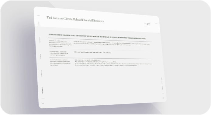 Task Force on Climate-Related Financial Disclosures TCFD O INTR METRICS AND TARGETS: DISCLOSE THE METRICS AND TARGETS USED TO ASSESS AND MANAGE RELEVANT CLIMATE-RELATED RISKS AND OPPORTUNITIES WHERE SUCH INFORMATION IS MATERIAL ANET a) Disclose the metrics used by the We track the following metrics to measure progress related to climate-related risks and opportunities: GHG emissions across our value chain, Higg Facility Environmental Module PL organization to assess climate-related risks data from suppliers representing nearly 80% of our spend, raw materials data for textile fibers and wood, and waste disposal data. and opportunities in line with its strategy and risk management process. b) Disclose Scope 1, Scope 2 and, if 2021 Impact Report: Climate & Energy, pages 21-26 (Scope 1, 2 and 3 emissions) appropriate, Scope 3 greenhouse gas emissions and the related risks. OPLE PE c) Describe the targets used by the 2021 Impact Report: Company-Wide Goals, pages 11-12 organization to manage climate-related 2021 Impact Report: Appendix, Carbon & Electricity Intensity, GHG Emissions, pages 89-92 risks and opportunities and performance We set a Science-Based Target across all three scopes and a carbon neutral goal across our operations. We also set a landfill diversion goal that we will continue to progress toward. against targets. We will expand beyond our current goals for responsibly sourced cotton and wood to identify opportunities for responsibly sourced materials. PURPOSE T 2021 T REPOR C A APPENDIX IMP 117 118