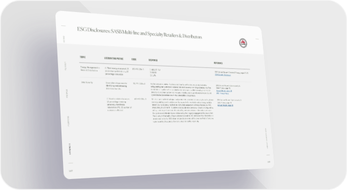 ESG Disclosures: SASB Multi-line and Specialty Retailers & Distributors O INTR TOPIC ACCOUNTING METRIC CODE RESPONSE REFERENCE ANET Energy Management in (1) Total energy consumed, (2) CG-MR-130a. 1 (1) 963,231 GJ 2021 Impact Report: Climate & Energy, pages 21-26 PL Retail & Distribution percentage grid electricity, (3) (2) 98.8% CDP Climate Disclosure percentage renewable (3) 1.2% Data Security Description of approach to CG-MR-230a. 2 As the consumer and our business continue to shift online, we are dedicated to 2021 Impact Report: Cybersecurity & identifying and addressing safeguarding our customers’ personal information and prioritizing cybersecurity. This Data Privacy, page 78 data security risks commitment is reflected in our governance structure; our data security policies and Annual Report, page 10 procedures; and our systems to measure, monitor, and respond to data breaches and WSI Privacy Policy OPLE cyberattacks. See references for full description of approach. PE (1) Number of data breaches, CG-MR-230a. 2 We use a series of technologies and practices to prevent data security breaches, detect 2021 Impact Report: Cybersecurity & (2) percentage involving and respond to potential data security issues. In the event of a policy change or data Data Privacy, page 78 personally identifiable breach, our policy requires that we notify data subjects in a timely manner. Our WSI Annual Report, page 10 information (PII), (3) number of associates, as well as third parties who provide services on our behalf, are required by customers affected policy, practice, and contract, if applicable, to treat customer information with care. Our policies and standards are reinforced by training and engagement to ensure that the privacy and security of our customers is central. WSI discloses this information in accordance with the SEC’s Commission Statement and Guidance on Public Company Cybersecurity Disclosures. See references for partial reporting. PURPOSE T 2021 T REPOR C A APPENDIX IMP 107 108