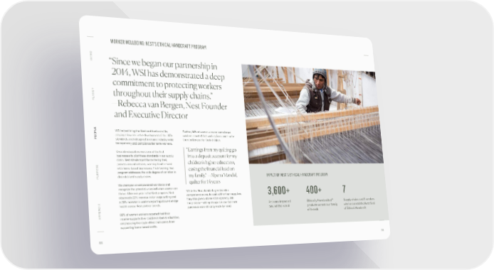 WORKER WELLBEING: NEST’S ETHICAL HANDCRAFT PROGRAM O INTR “Since we began our partnership in 2014, WSI has demonstrated a deep commitment to protecting workers ANET throughout their supply chains.” PL —Rebecca van Bergen, Nest Founder and Executive Director OPLE WSI helped bring the Nest certification to life, Further, 89% of women who are home-based PE playing a key role in the development of the 100+ workers reported that working from home helps standards, each designed to ensure industry-wide them better care for their children. transparency and compliance for home workers. “Earnings from my quilting go Once developed, we were one of the first businesses to pilot these standards in our supply into a deposit account for my chain. Nest stands apart for centering their children’s higher education, process around artisans, working hand-in-hand with home-based businesses. Their training-first easing the financial load on program addresses the wide degree of variation in PURPOSE decentralized supply chains. my family.” —Alpana Mandal, IMPACT OF NEST’S ETHICAL HANDCRAFT PROGRAM We champion an empowered workforce and quilter for 14 years recognize the potential unlocked when women can While the Nest standards give brands a thrive. After one year in the Nest program, Nest comprehensive way to work with artisan suppliers, 3,600+ 400+ 7 T 2021 observed a 22% increase in fair wage setting and they also give customers transparency into a 20% increase in women reporting above-average the process—letting shoppers know that their Artisans impacted Ethically Handcrafted™ Supply chains and 5 vendors health across Nest partner brands. purchases were ethically made by hand. T REPOR around the world products across our family who’ve earned the Nest Seal C 80% of women workers reported that their of brands of Ethical Handcraft A APPENDIX income supports their children’s formal education, IMP emphasizing the ripple effect that comes from supporting home-based crafts. 55 56