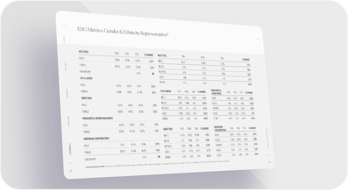 ESG Metrics: Gender & Ethnicity Representation* O INTR WSI TOTAL FY19 FY20 FY21 % CHANGE WSI TOTAL FY19 FY20 FY21 % CHANGE MALE 31.8% 34.8% 32.4% -2.4% WHITE 61.0% 55.9% 54.8% -1.1% FEMALE 68.2% 65.2% 67.5% 2.5% BLACK 12.6% 15.4% 13.8% -1.6% ANET HISPANIC 14.9% 16.0% 16.1% 0.1% PL NON-BINARY 0.1% NA ASIAN 7.0% 8.0% 11.1% 3.1% VPS & ABOVE OTHER 4.5% 4.6% 4.2% -0.4% MALE 48.2% 48.2% 45.9% -2.3% VPS & ABOVE FY19 FY20 FY21 % CHANGE MANAGERS & FY19 FY20 FY21 % CHANGE OPLE FEMALE 51.8% 51.8% 54.1% 2.3% SENIOR MGRS. PE DIRECTORS WHITE 79.3% 79.4% 74.9% -4.5% WHITE 66.1% 65.1% 59.1% -6.0% BLACK 2.1% 2.8% 2.4% -0.4% BLACK 7.2% 8.1% 7.6% -0.5% MALE 37.2% 38.6% 40.7% 2.1% HISPANIC 2.1% 2.1% 2.4% 0.3% HISPANIC 9.3% 10.2% 10.0% -0.2% FEMALE 62.8% 61.5% 59.3% -2.1% ASIAN 12.1% 10.6% 16.2% 5.6% ASIAN 12.5% 11.6% 18.7% 7.1% MANAGERS & SENIOR MANAGERS OTHER 4.3% 5.0% 4.2% -0.8% OTHER 4.8% 5.1% 4.6% -0.5% PURPOSE MALE 36.1% 35.6% 36.7% 1.1% DIRECTORS FY19 FY20 FY21 % CHANGE INDIVIDUAL FY19 FY20 FY21 % CHANGE FEMALE 63.9% 64.4% 63.3% -1.1% CONTRIBUTORS INDIVIDUAL CONTRIBUTORS WHITE 74.4% 73.6% 68.7% -4.9% WHITE 60.2% 53.9% 53.8% -0.1% T 2021 MALE 31.1% 34.5% 31.6% -2.9% BLACK 2.9% 3.5% 2.9% -0.6% BLACK 13.3% 16.9% 14.9% -2.0% T REPOR HISPANIC 3.9% 3.5% 4.0% 0.5% HISPANIC 15.7% 17.3% 17.2% -0.1% C FEMALE 68.9% 65.5% 68.3% 2.9% A APPENDIX ASIAN 14.5% 14.4% 20.1% 5.7% ASIAN 6.4% 7.3% 9.9% 3.3% IMP NON-BINARY 0.1% NA OTHER 4.4% 4.5% 4.3% -0.2% OTHER 4.5% 4.6% 4.2% -0.4% *CALCULATION & SCOPE FY21 data as of 1/30/2022. Percentages exclude associates who declined to state gender or ethnicity. FY21 data represents global workforce, including full-time, part-time and temporary or seasonal associates. 97 98