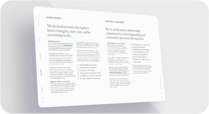 BUSINESS INTEGRITY CYBERSECURITY & DATA PRIVACY O INTR We do business with the highest We’re dedicated to prioritizing level of integrity, every day and in cybersecurity and safeguarding our everything we do. customers’ personal information. ANET BUSINESS ETHICS As a design-driven company, our in-house quality CYBERSECURITY & DATA PRIVACY We safeguard our customers’ PL We’re committed to conducting our global business professionals are engaged from the very beginning We take a proactive, highly conservative ethically and with integrity. Our Code of Business of our design process, informing material selection approach to cybersecurity, with the intention of personal information, Conduct & Ethics stands against corruption in all and product development with safety in mind. preventing harm. This commitment is reflected conducting internal testing its forms and establishes expectations to guide in our governance structure, our data security ethical decision-making by our associates. We have a global team of product quality and policies and procedures and our systems to and assessments monthly, assurance professionals who test all our products measure, monitor and respond to data breaches third-party assessments Our Vendor Code of Conduct outlines our for safety and restricted substances. To guarantee and cyberattacks. OPLE expectations of ethical behavior by our business that we communicate the correct information to quarterly and external PE partners. We require all associates to complete customers, we have an internal review process and Our Chief Technology Officer and Chief Information independent audits at least a Code of Conduct Questionnaire annually to work with third-party certification organizations Security Officer have a dedicated team of reinforce our expectations. Every associate and where needed to provide accurate product claims. professionals focused on cybersecurity and data once a year. business partner has a responsibility to act with protection, and we invest in continuous monitoring the highest ethical standards. Our products are tested and improvement of our systems. Our policies and standards are reinforced by training and engagement to ensure our customers’ To foster an environment of open, honest at either one of our WSI We review and update our dedicated Standard privacy and security is central. We disclose communication, associates across our offices, in-country labs or by Operating Procedures, policies and standards this information in accordance with the SEC’s stores and factories have access to a third-party annually. In 2021, we updated our Cybersecurity Commission Statement and Guidance on Public ethics hotline to report any potential violations, independent, third-party labs & Data Privacy Commitment to respond to Company Cybersecurity Disclosures. PURPOSE while ensuring confidentiality and transparency. stockholder concerns and more clearly articulate Whistleblower protections are included in our Code certified by the U.S. Consumer our approach to cybersecurity and data privacy. of Business Conduct & Ethics. Product Safety Commission. Our associates, as well as third parties who PRODUCT SAFETY & TESTING provide services on our behalf, are required by T 2021 At WSI, we are committed to high-quality, safe and policy, practice, and contract (if applicable) to treat long-lasting products for our customers. In addition customer information with care. We also closely to complying with rules and regulations related monitor emerging data privacy laws to ensure T REPOR to marketing and product safety and testing, we legal compliance. C invest in up-front technical expertise to inform A APPENDIX product design and development. IMP 77 78
