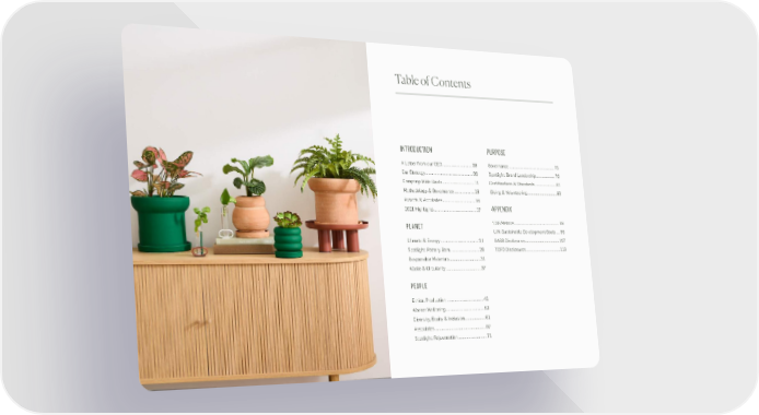 Table of Contents O INTR INTRODUCTION PURPOSE ANET PL A Letter from our CEO ........................... 08 Governance ............................................ 75 Our Strategy ........................................... 09 Spotlight: Brand Leadership ......................79 Company-Wide Goals .............................11 Certifications & Standards. ....................81 Methodology & Governance ...................13 Giving & Volunteering..................................83 Awards & Accolades ..............................16 OPLE 2021 Highlights .......................................17 APPENDIX PE PLANET ESG Metrics ........................................... 89 U.N. Sustainable Development Goals ...99 Climate & Energy ...................................21 SASB Disclosures .......................................107 Spotlight: Pottery Barn. ......................... 29 TCFD Disclosures .......................................113 Responsible Materials ................................. 31 PURPOSE Waste & Circularity ......................................37 PEOPLE T 2021 Ethical Production ................................. 45 Worker Wellbeing. .................................. 53 T REPOR Diversity, Equity & Inclusion ......................61 C A APPENDIX Associates ......................................................67 IMP Spotlight: Rejuvenation ............................... 71 3 4