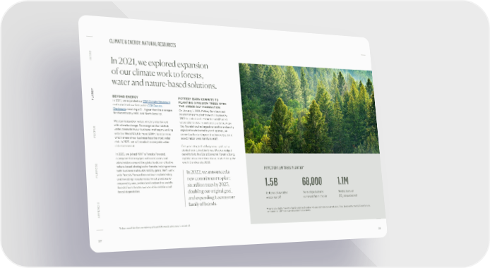 CLIMATE & ENERGY: NATURAL RESOURCES O INTR In 2021, we explored expansion of our climate work to forests, water and nature-based solutions. ANET BEYOND ENERGY POTTERY BARN COMMITS TO PL In 2021, we expanded our CDP Climate Disclosure PLANTING 3 MILLION TREES WITH and submitted our first public CDP Forests THE ARBOR DAY FOUNDATION Disclosure, receiving a B–, higher than the averages On January 1, 2021, Pottery Barn launched for discretionary retail and North America. a commitment to plant three million trees by 2023 to protect and restore the world’s most We also focused on water, which is intertwined vulnerable forests. In partnership with the Arbor with climate change. We recognize the risk that Day Foundation, the largest nonprofit membership OPLE water presents to our business, and began working organization dedicated to planting trees, we PE with the World Wildlife Fund (WWF) to determine committed to planting one tree for every piece of which areas of our business face the most water select indoor wood furniture sold*. risk. In 2022, we will conduct a complete water risk assessment. One year later, and halfway to our goal, we’ve planted over 1.5 million trees. We also pledged In 2021, we joined WWF’s Forests Forward, our efforts to the World Economic Forum’s 1t.org, a program that engages with companies and a global movement to conserve, restore and grow stakeholders around the globe to deliver effective one trillion trees by 2030. nature-based strategies for forests, helping achieve IMPACT OF 1.5M TREES PLANTED* both business and sustainability goals. We’ll work In 2022, we announced a PURPOSE with Forests Forward to continue implementing and investing in sustainable forest practices to new commitment to plant responsibly use, protect and restore the world’s six million trees by 2023, 1.5B 68,000 1.1M forests from threats such as deforestation and forest degradation. doubling our original goal, T 2021 and expanding it across our Gallons of avoided Tons of pollutants Metric tons of water runoff removed from the air CO sequestered family of brands. 2 T REPOR C *Metrics provided by the Arbor Day Foundation. Based on 40-year estimates calculated using i-Tree, developed by the U.S. Forest Service, A APPENDIX and based on 1.5M trees planted across many projects. IMP *Indoor wood furniture containing at least 80% wood; upholstery is excluded. 27 28