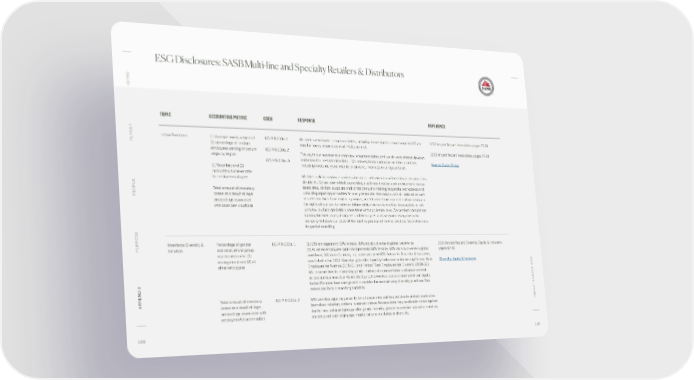 ESG Disclosures: SASB Multi-line and Specialty Retailers & Distributors O INTR TOPIC ACCOUNTING METRIC CODE RESPONSE REFERENCE ANET Labor Practices (1) Average hourly wage and CG-MR-310a. 1 We continue to invest in our associates, including increasing minimum wage to $15 per 2021 Impact Report: Associates, pages 77-78 PL (2) percentage of in-store hour for hourly associates as of FY21 year end. employees earning minimum CG-MR-310a. 2 2021 Impact Report: Associates, pages 77-78 wage, by region The key to our success as a company is our associates, and we strive to attract, develop CG-MR-310a. 3 and retain the best talent in Retail. We actively track and report on labor practices, Human Rights Policy (1) Voluntary and (2) including involuntary and voluntary turnover, internally on a regular basis. involuntary turnover rate for in-store employees We take pride in keeping a work environment that complies with employer responsibility standards. We are committed to providing a safe and healthy work environment for our OPLE Total amount of monetary associates, visitors, suppliers and contractors, maintaining respectful workplaces and PE losses as a result of legal upholding equal opportunities for every associate. We comply with all national as well proceedings associated as state and local laws regarding wages, benefits and hours worked, and we recognize with labor law violations the rights of workers to make an informed decision as to whether to associate or not with any lawful organization, consistent with applicable laws. We conduct compliance training for executives, managers and employees, and we expect everyone in the company to follow our Code of Conduct, regardless of rank or position. See references for partial reporting. PURPOSE Workforce Diversity & Percentage of gender CG-MR-330a. 1 (1) WSI management: 62% female, 39% racially diverse in global workforce 2021 Impact Report: Diversity, Equity & Inclusion, Inclusion and racial/ethnic group (2) All other employees (not management): 68% female, 46% racially diverse in global pages 61-66 representation for (1) workforce. Williams-Sonoma, Inc. is a member of CEO Action for Diversity & Inclusion, management and (2) all was listed in the 2022 Bloomberg Gender-Equality Index and ranks among Forbes’ Best Diversity, Equity & Inclusion other employees Employers for Women (2019-21) and Forbes’ Best Employers for Diversity (2020-22). We’re committed to increasing gender and racial representation and advancement T 2021 across our business. Our Associate Equity Networks are a core element of our Equity Action Plan and lead change and innovation for our company diversity practices. See references for full reporting and data. T REPOR C Total amount of monetary CG-MR-330a. 2 WSI provides equal opportunity for all associates and has policies to protect associates A APPENDIX losses as a result of legal from discriminatory actions in our workplace. No associate may be discriminated against IMP proceedings associated with due to race, color, religion, gender, gender identity, gender expression, sexual orientation, employment discrimination ancestry, national origin, age, marital or veteran status or disability. 109 110