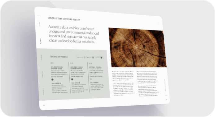 DATA COLLECTION & SUPPLY CHAIN VISIBILITY O INTR Accurate data enables us to better understand environmental and social impacts and risks across our supply ANET chain to develop better solutions. PL OPLE TRACKING OUR PROGRESS Just Started In Progress Completed PE 2021 2021 2023 50% RESPONSIBLY 100% RESPONSIBLY 6M TREES PLANTED SOURCED WOOD SOURCED COTTON In unity with our family of One of our largest-volume We remain committed to brands, WSI recently doubled We continuously raise the bar to collect and verify We’re exploring approaches to dive deeper into materials, responsible wood is maintaining 100% responsibly its goal, pledging to plant 6M quality vendor and raw material data, using both our supply chain, beyond vendors to raw materials key to preventing deforestation. sourced cotton across WSI. trees by 2023. a bottom-up and a top-down approach. Our global at each stage of production. With corporate-wide PURPOSE STATUS: EXCEEDED STATUS: COMPLETED STATUS: JUST STARTED sustainability team collects thousands of vendor sustainability goals that require action from each chain-of-custody and transaction certificates to of our brands, robust internal reporting is key. We support product sustainability claims. create mid-year and year-end reports for each 2021 UPDATE 2021 UPDATE 2021 UPDATE brand, presenting overall progress to our goals, as We exceeded our 50% As of 2021, 94% of our cotton Pottery Barn surpassed the In 2021, we implemented Sourcemap, a new tool well as each brand’s individual contributions. T 2021 responsibly sourced wood is responsibly sourced, halfway point, planting 1.5M to enable better data collection and traceability goal one year early, with the remaining 3% in trees—well on their way to of raw materials. Moving forward, we will use Our reports capture SKU-level detail and raw reaching >60% in 2020 and transition, 2% not going forward their original 3M goal. Sourcemap to focus on key materials, such as material content, allowing us to tie individual T REPOR wood, cotton and leather. Supply chain issues products to our overarching corporate C maintaining our commitment. and 1% being confirmed. A APPENDIX are both environmental and social, and we’re sustainability goals. What gets measured gets IMP using tools to gain greater visibility into labor and managed, and the regular cadence of our reporting environmental risks. combined with granular data results in more effective conversations about driving progress. 35 36