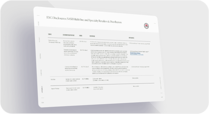 ESG Disclosures: SASB Multi-line and Specialty Retailers & Distributors O INTR TOPIC ACCOUNTING METRIC CODE RESPONSE REFERENCE ANET Product Sourcing, Revenue from products CG-MR-410a. 1 YE 2021 41.2% of our cross-brand net sales was from product* certified by third-party 2021 Impact Report: Brand Leadership, pages 79-80 PL Packaging & Marketing third-party certified to social and environmental standards, with an additional 2.5% from our internally verified environmental and/or social recycled declaration process. *U.S. & Canada, excludes drop-ship products. sustainability standards Discussion of processes to CG-MR-410a. 2 All of the products we sell are required to meet national and state laws for restricted 2021 Impact Report: Business Integrity, page 77 assess and manage risks and/ substances and emissions, and we invest in meeting and exceeding these standards Product Safety & Testing or hazards associated with throughout the WSI value chain—from design to production to testing. Our global team Responsible Materials & Finishes chemicals in products of product quality professionals support our global sourcing offices and vendor base, OPLE setting clear standards around restricted substances and emissions. Our network of PE quality assurance professionals and on-the-ground experts work directly with our vendor base to establish clear product reviews, develop testing protocols and implement routine inspections. We operate in-country labs in our major sourcing regions to inform product development. See references for full description of approach. Discussion of strategies to CG-MR-410a. 3 We are focused on reducing excess packaging, eliminating EPS foam, and increasing 2021 Impact Report: Packaging, pages 39-40 reduce the environmental recycled content in packaging materials. Our brand packaging teams aligned on a impact of packaging strategy to eliminate unnecessary packaging and transition to less impactful packaging materials, including investing in resources to explore more sustainable packaging PURPOSE alternatives. See references for full description of approach. Facilities Number of: (1) retail locations CG-MR-000.a (1) 544 retail stores Not applicable. (2) distribution centers (2) 25 distribution centers and hubs T 2021 Square Footage Total area of: (1) retail space CG-MR-000.b (1) 6,004,000 sq. feet Not applicable. T REPOR C (2) distribution centers (2) 11,792,617 sq. feet A APPENDIX IMP 111 112