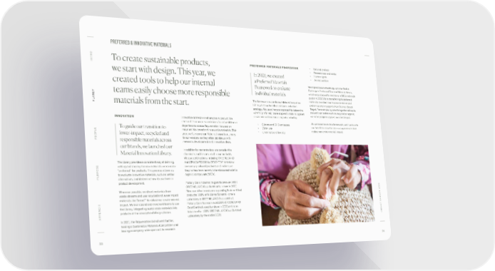 PREFERRED & INNOVATIVE MATERIALS O INTR To create sustainable products, PREFERRED MATERIALS FRAMEWORK • Soil and land use • Resource use and waste we start with design. This year, we In 2021, we created • Human rights • Animal welfare a Preferred Materials created tools to help our internal Framework to evaluate We aligned our methodology with the Textile Exchange’s Preferred Fiber and Material Matrix, individual materials. which was released to members in 2021 and made teams easily choose more responsible public in 2022. We’re transitioning to preferred ANET The framework supports our Material Innovation materials to reduce our environmental impact PL materials from the start. Library and our broader emissions reduction and emissions in support of our Science-Based strategy. We use a lifecycle approach to determine Target. For example, by prioritizing alternatives to what’s “preferred,” assessing each material against conventional cotton such as recycled or organic, environmental and social impacts including: we make progress against our climate goal. INNOVATION innovative materials and propose a product. We received 14 concept submissions from five different • Climate and GHG emissions As we transition to this framework, we’ll work with To guide our transition to departments across Rejuvenation, focused on • Water use our brands to raise the bar—using materials that recycled, bio-based and renewable materials. This • Chemicals and toxicity reduce our environmental impact. OPLE lower-impact, recycled and year, we’ll expand our Material Innovation Library PE responsible materials across to our vendors, as they often provide us with research, development and innovative ideas. our brands, we launched our In addition to raw materials, we consider the Material Innovation Library. chemicals and finishes used in our products. We use certifications including GREENGUARD The library provides a consistent way of defining, and STANDARD 100 by OEKO-TEX® to test our vetting and sharing the raw materials we consider company-produced products and make sure “preferred” for products. This process allows us they’re free from harmful chemicals and volatile PURPOSE to evaluate innovative materials, such as leather organic compounds (VOCs). alternatives, and determine how to use them in product development. Pottery Barn Kids met its goal to produce 100% GREENGUARD Gold Certified furniture in 2020. Wherever possible, we divert materials from Now, our other brands are expanding their certified T 2021 waste streams and use recycled and lower impact products: 100% of Williams Sonoma Home’s materials like Tencel™ to reduce our environmental upholstery is GREENGUARD Gold certified, impact. We train brand and merchant teams to use Pottery Barn Teen achieved 100% GREENGUARD the library, integrating sustainable materials into Gold Certified wood furniture in 2021 and is on T REPOR products at the concept and design phases. track to offer 100% GREENGUARD Gold Certified C A APPENDIX upholstery by the end of 2022. IMP In 2021, the Rejuvenation brand went further, hosting a Sustainable Materials Competition and issuing a company-wide open call to research 33 34