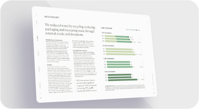 WASTE & CIRCULARITY O INTR We reduced waste by recycling, reducing LANDFILL DIVERSION* DCs/HUBS STORES OFFICES packaging and increasing reuse through TOTAL DIVERSION RATE renewal, resale and donations. 2021 43% total 2020 45% total ANET PROGRESS & ACTION PLAN don’t directly manage waste. To drive change, we 2019 49% total 75% goal PL Meeting our 75% landfill diversion goal has been continue to work with industry associations and challenging due to the lack of national recycling landlords—adding language to leases to support DCs/HUBS DIVERSION RATE infrastructure. With different services and landfill diversion, demonstrating the importance of providers in every location, it’s taken longer than environmental goals to our partners. 2021 48% anticipated to standardize data and systems. Realizing we needed more time to reach 75% DISTRIBUTION CENTERS 2020 51% landfill diversion, we extended our goal from Throughout 2021, our distribution centers dealt OPLE 2021 to 2025. 2021 saw progress with internal with rapid business expansion and challenges due 2019 56% 75% goal PE engagement across the organization to identify to COVID-19—from prioritizing the health and implement solutions. Our retail stores and and safety of our associates to disruptions in distribution centers (DCs) contribute the most to recycling services. Even with these setbacks, we: STORES DIVERSION RATE our waste footprint, and they’re also our greatest 1) Refined data collection from our waste and levers to achieve change. recycling providers, 2) Ensured that cardboard, 2021 40% foam and plastics entered recycling streams, 3) 2020 40% STORES Embedded software logic to filter returns into To move closer to our goal, we created a resale, donation or renewable/recycling streams 2019 45% 75% goal retail taskforce with representatives from our and 4) Launched a portal to streamline donations distribution centers, store operations, procurement, to nonprofit partners. We continued to work with PURPOSE real estate, supply chain, and sustainability teams. donation partners, such as Good360, Habitat for OFFICES DIVERSION RATE Our stores implemented major initiatives including: Humanity, and St. Vincent de Paul Society. Our new 1) Backhauling expanded polystyrene (EPS) foam donation process drives support and resources to 2021 41% to our distribution centers where it can be sent to these organizations. recyclers, 2) Batteries and lightbulb recycling at all 2020 41% T 2021 stores and 3) Donation partnerships for unsellable With new systems in place, products. We also continued conducting waste 2019 55% 75% goal audits to identify further solutions. In our managed we aim to drive significant T REPOR locations, where we directly control operations, C A we rightsized waste and recycling collection progress in 2022, with a goal * APPENDIX services in late 2021 CALCULATION & SCOPE Calculated since 2017 by Rubicon annual tonnage report, WSI DC monthly report and manual data IMP —matching our 75% diversion of reaching 75% landfill collection. Percent of recycled and composted volume diverted from landfill in metric tons. Scope includes distribution centers, goal. In stores, one of our biggest challenges is in-sourced hubs, corporate offices and retail stores in North America. In 2016, EPA’s factor for waste changed from 225 pounds leasing in larger facilities, such as malls, where we per yard to 138. The new factor was applied in 2017–2021. We also revised our FY20 landfill metrics after identifying an incorrect diversion by 2025 or sooner. categorization of waste type. BOARD DIVERSITY METRICS 2021 37 38