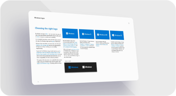 Windows logos 4 logos on dark Choosing the right logo By default, our logo is blue —our core color, the color of open skies and limitless opportunities. But we also use it in white to improve contrast and readability. In co-branded executions, when all other logos present are gray, the Windows logo can be gray to harmonize. Between blue and white, we choose the color that will maximize the contrast ratio between the logo and the background, always meeting our accessibility requirements. In general, the Windows logo should only be used in conjunction with the software product itself, or with devices that actually run the operating system , not with other devices like peripherals and accessories, nor to show compatibility for other software products. Throughout this document, we usually illustrate proper usage using one Windows logo. Still, the same rules apply to all Windows logos , including edition lockups. Use the Windows logo when communicating about the overall brand , several offerings within the Windows product family , IoT , and self -contained VR/MR headsets . When referring to a previous version of Windows (e.g., Windows 8.1) use the Windows logo and refer to the specific version in text. Do not add “8.1” or “10” to the Windows logo or use retired logos. Use the Windows 11 logo whenever talking specifically about Windows 11 , Windows 11 features , or Windows 11 devices (except for IoT devices and self -contained head - mounted displays). Use the Windows 365 logo whenever talking specifically about Windows 365 or Windows 365 features . If needed, use the Windows 10 logo whenever talking specifically about Windows 10, Windows 10 features, or Windows 10 devices (except for IoT devices and self -contained head - mounted displays). Otherwise, use the Windows logo and refer to Windows 10 in text.