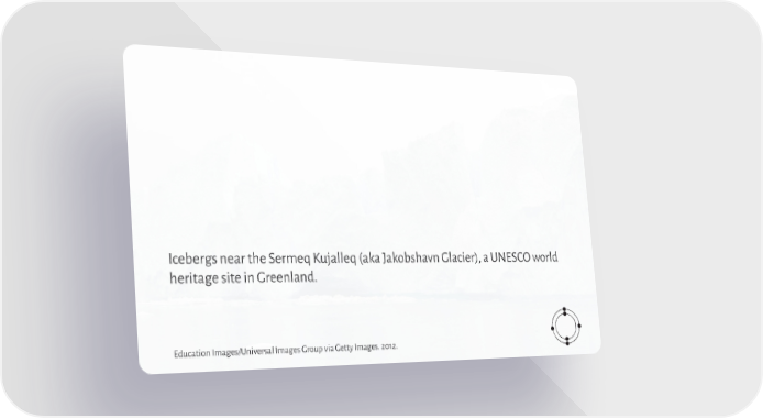 Icebergs near the Sermeq Kujalleq (aka Jakobshavn Glacier), a UNESCO world heritage site in Greenland. Education Images/Universal Images Group via Getty Images. 2012.