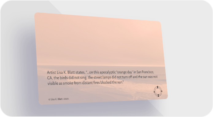 Artist Lisa K. Blatt states, “...on this apocalyptic “orange day” in San Francisco, CA, the birds did not sing, the street lamps did not turn off and the sun was not visible as smoke from distant fires blocked the sun.” © Lisa K. Blatt. 2020.