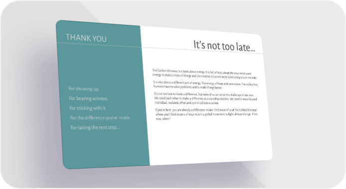 THANK YOU It’s not too late… The Carbon Almanac is a book about energy. It is full of facts about the ways we’ve used energy to make a mess of things and the creative solutions we’re developing to turn the tide. It is also about a different sort of energy. The energy of hope and connection. The ability that For showing up. humans have to solve problems and to make things better. It’s not too late to make a difference, but none of us can solve this challenge on our own. For bearing witness. We need each other to make a difference at a scale that matters. We need to move beyond individual, isolated, effort and join in collective action. For sticking with it. If you’re here, you are already a difference-maker. Find more of us at The Carbon Almanac For the difference you’ve made. where you’ll find dozens of ways to join a global movement to fight climate change. If not now, when? For taking the next step….