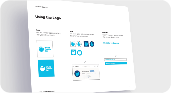 World Oceans Day Brand Manual 9 LOGO GUIDELINES Using the Logo Logo Use the primary logo everywhere the type will read clearly. Mark Use when space is limited, and where the name is already present. Web URL Use in thin spaces, or anywhere the logo can’t be stacked legibly. WorldOceansDay.org WorldOceansDay.org WorldOceansDay.org