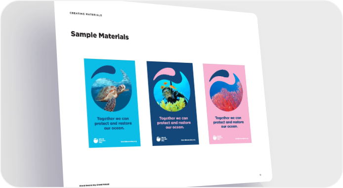 World Oceans Day Brand Manual 18 C R E ATI N G M AT E R I A L S Sample Materials W orld Oce ns Dy Together we cn protect nd restore our ocen. WorldOceansDay.org W orld Oce ns Dy Together we cn protect nd restore our ocen. WorldOceansDay.org W orld Oce ns Dy Together we cn protect nd restore our ocen. WorldOceansDay.org