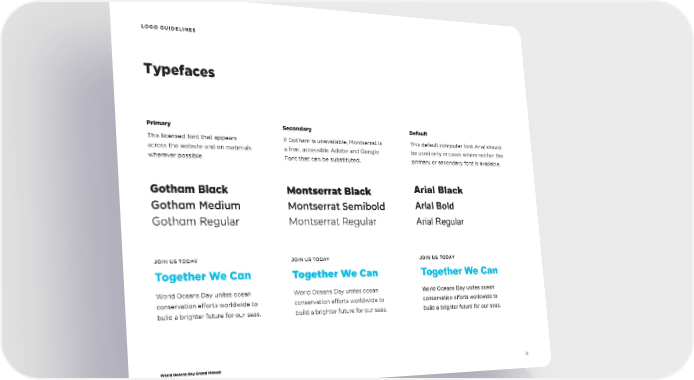 World Oceans Day Brand Manual 13 LOGO GUIDELINES Typefaces Primary This licensed font that appears across the website and on materials wherever possible. Secondary If Gotham is unavailable, Montserrat is a free, accessible Adobe and Google Font that can be substituted. Default This default computer font Arial should be used only in cases where neither the primary or secondary font is available. Gotham Black Gotham Medium Gotham Regular Montserrat Black Montserrat Semibold Montserrat Regular Arial Black Arial Bold Arial Regular JOIN US TODAY Together We Can World Oceans Day unites ocean conservation efforts worldwide to build a brighter future for our seas. JOIN US TODAY Together We Can World Oceans Day unites ocean conservation efforts worldwide to build a brighter future for our seas. JOIN US TODAY Together We Can World Oceans Day unites ocean conservation efforts worldwide to build a brighter future for our seas.