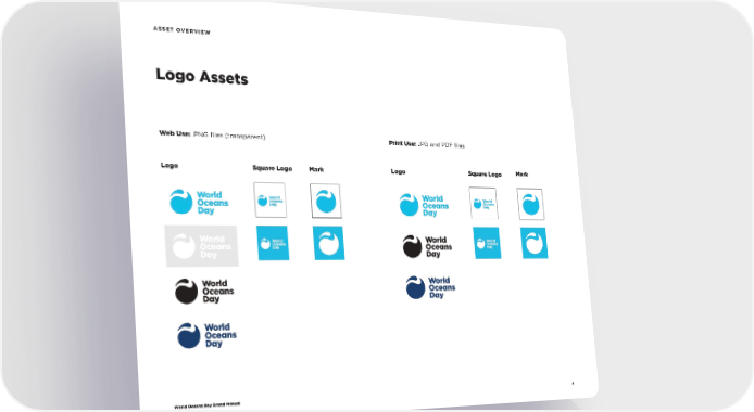 WOD Brand Book Page 3 Page 5World Oceans Day Brand Manual 4 Logo Assets ASSET OVERVIEW Web Use: .PNG files (transparent) Logo Logo Square Logo Square Logo Mark Mark Print Use: JPG and PDF files