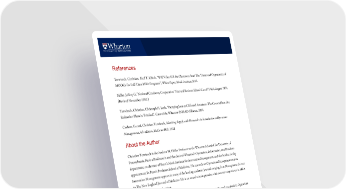 25 References Terwiesch, Christian, Karl T. Ulrich, “Will Video Kill the Classroom Star? The Threat and Opportunity of MOOCs for Full -Time M BA Programs”, White Paper, Mack Institute 2014 Miller, Jeffrey G. "National Cranberry Cooperative." Harvard Business School Case 675 -014, August 1974. (Revised November 1983.) Terwiesch, Christian, Christoph H. Loch, “Pumping Iron at Cliffs and Associates: The Circored Iron Ore Reduction Plant in Trinidad”, Case of the Wharton -INSEAD Alliance, 2004 Cachon, Gerard, Christian Terwiesch, Matching Supply with Demand: An Introduction to Operations Management , 4th edition, McGraw Hill, 2018 About the Author Christian Terwiesch is the Andrew M. Heller Professor at the Wharton School of the University of Pennsylvania. He is a Professor in and the chair of Wharton’s Operations, Information, and Decisions department, co- director of Penn’s Mack Institute for Innov ation Management, and also holds a faculty appointment In Penn’s Perelman School of Medicine. His research on Operations Management and on Innovation Management appears in many of the leading academic journals ranging from Management Science to The New Eng land Journal of Medicine. He is an award winning teacher with extensive experience in MBA teaching and executive education. Professor Terwiesch is the co- author of Matching Supply with Demand , a widely used text- book in Operations Management that is now in its third edition. Based on this book, Professor Terwiesch has launched the first Massive Open Online Course (MOOC) in business on Coursera. By now, well over half a million students enrolled in the course. His first management book, Innovation Tournaments, was published by Harvard Business School Press. The novel, process -based approach to innovation outlined in the book was featured by BusinessWeek, the Financial Times, and the Sloan Management Review and has lead to innovation tournaments in organizations around the world. His latest book, Connected Strategies, combines his expertise in the fields of operations, innovation, and strategy to help companies take advantage of digital technology leading to new business models. The book has