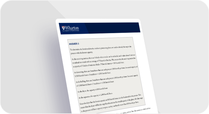 8 ANSWER 3 To determine the bottleneck in the cranberry processing plant, we need to identify the step in the process with t he lowest capacity. At the receiving station, there are 5 docks where trucks can be unloaded, and it takes about 8 minutes to unload one truck with an average of 75 barrels of berries. This means that the receiving station has a capacity of 5 docks x 8 minutes/dock x 75 barrels/minute = 300 barrels/hour. At destoning, there are 3 machines that can each process 1,500 barrels per hour, for a total capacity of 1,500 barrels/hour x 3 machines = 4,500 barrels/hour. At dechaffing, there are 3 machines that can each process 1,500 barrels per hour, for a total capacity of 1,500 barrels/hour x 3 machines = 4,500 barrels/hour. At the dryer, the capacity is 600 barrels/hour. At the separator, the capacity is 1,200 barrels/hour. Since the dryer has the lowest capacity at 600 barrels/hour, it is the bottleneck in the process. This means that the dryer will be the step that determines the overall capacity of the plant. All other steps in the process will have capacity to spare, as they can handle more than 600 barrels per hour. This answer of pointing to the dry er as the bo ttleneck is, once again, correct. But, the answ er as a whole at best de serves a C as a grade as Chat GPT made two significant mistakes. First, th e ca pacity calculations at the receiving station might sound plausible, but th ey a re wrong. T he answer given by Chat GPT “This means that the re ceiving statio n has a capacity of 5 docks x 8 minutes/dock x 75 barrels/minute = 300 barrels/hour” does not correctly capt ure the capacity of the receiving statio n. Inst ead, the capacity should be calculated as “5 docks x 60 minutes/hour *1/8 trucks/minute * 75 barrels/ truck = 2812.5 barrels/hour. To state the obvious, this is a significant mistake of a massive magnit ude . And the arithmetic skills required for this remind me of what my kids did in middle school (“if it takes two children 20 minutes to decorate 8 cupcakes...”).