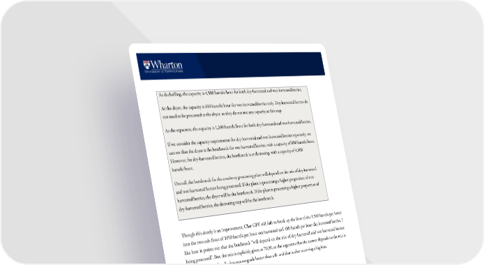 10 At dechaffing, the capacity is 4,500 barrels/hour for both dry - harvested and wet - harvested berries. At the dryer, the capacity is 60 0 barrels/hour for wet -harvested berries only. Dry -harvested berries do not need to be processed at the dryer, so they do not use any capacity at this step. At the separator, the capacity is 1,200 barrels/hour for both dry -harvested and wet- harvested berri es. If we consider the capacity requirements for dry -harvested and wet- harvested berries separately, we can see that the dryer is the bottleneck for wet -harvested berries, with a capacity of 600 barrels/hour. However, for dry -harvested berries, the bottleneck is at destoning, with a capacity of 4,500 barrels/hour. Overall, the bottleneck for the cranberry processing plant will depend on the mix of dry -harvested and wet -harvested berries being processed. If the plant is processing a higher proportion of wet- harvested berries, the dryer will be the bottleneck. If the plant is processing a higher proportion of dry- harvested berries, the destoning step will be the bottleneck. Tho ugh this clearly is an improvement, Chat GPT still fails to break up the flow of the 1,500 barrels per hours int o the two sub-f lows of 1050 barrels per hour wet-h arvested and 450 barrels per hour dry h arv ested be rries. I like how it points out that the bottleneck “will depend on the mix of dry-h a rvested and wet-h arv ested berries being processed”. But, the mix is explicitly given as 70:30, so the argument that the answer depends on the mix is no t satisfactory and really de serves no grade better than a B - and that is after receiving a big hint. QUEUEING ANALYSIS An im portant concept in Operations Management relates to variability in demand and in proce ssing time s. If you have 10 customers arrive over t he course of an hour, you cannot assume that a customer arrives exactly every six minutes. Such variability can le ad to congestion and custome r waiting times in a process that has enough capacity on average. For example, a process with a 90% capacity utilization and random arrivals will lead to periods of substantial wait times. The branch of operations management that is concerned with this effect is appropriately referred to as queueing analysis and is well studied in Operat ions Research, Industrial Engine ering and Computer Science. Consider the fo llowing question.
