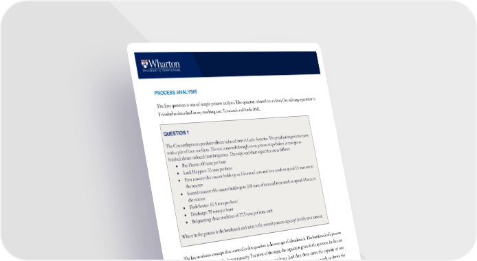 4 PROCE SS ANALYSIS The first question is one of simple process analysis. The question is based on an Iron Ore refining operation in Trinidad as described in my teaching case Terwiesch and Loch 2002. QUESTION 1 The Circored process produces direct reduced iron in Latin America. The production process starts with a pile of iron ore fines. The ore is moved through seven process steps before it emerges as finished direct -reduced -iron briquettes. The steps and their capacities are as follows: • Pre- Heater: 60 tons per hour • Lock Hoppers: 55 tons per hour • First reactor: this reactor holds up to 14 tons of iron and iron needs to spend 15 minutes in the reactor • Second reactor: this reactor holds up to 200 tons of iron and iron needs to spend 4 hours in the reactor • Flash hea ter: 62.5 tons per hour • Discharge: 59 tons per hour • Briquetting: three machines of 27.5 tons per hour each Where in the process is the bottleneck and what is the overall process capacity? Justify your answer. The key academic concept that is tested in this question is the concept of a bottleneck. The bo ttle neck of a process is the process step with the lowest capacity. For most of the steps, the capacity is give n in t he question. In the case of briquetting, one needs to realize that there are three machines (and thus three times the capacity of one machine). Moreover, the capacity calc ulations fo r the two reactors are not trivial as one needs to derive the capacity by dividing the size of the reactor (e.g., 200 tons) by the reaction time (4 hours). Finally, we should not forget that this question requires a fair bit o f natural language processing to absorb the input and to create the output. So , let’s see what happened when I entered this verbatim int o t he Chat GPT prompt.