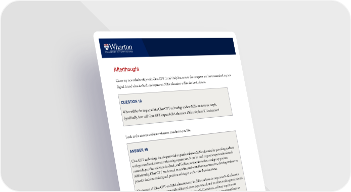 24 Afterthought Gi ven my new relationship with Chat GPT , I can’t help but turn to the computer one last time and ask my new di gital f riend what it thinks i ts i mpact on M BA ed ucation w ill b e the in th e f uture. QUESTION 10 Wh at will be the impact of the Chat G PT technology on how MBA students are taught. Specifically, how will Chat GPT impact MBA education differently from K12 education? Look at t he answer and draw whatever conclusion you like. ANSWER 10 Chat GPT technology has the potential to greatly enhance MBA education by providing students with personalized, interactive learning experiences. It can be used to generate personalized study materials, provide real -time feedback, and facilitate online discussions and group projects. Additionally, Chat GPT can be us ed to simulate real-w orld business scenarios, allowing students to practice decision -making and problem- solving in a safe, virtual environment. The impact of Chat GPT on MBA education may be different from its impact on K-1 2 education because MBA students are typically older and more experienced, and are often working professionals. They may have different learning styles and needs than K -12 students, and may require more advanced, specialized content. Additionally, MBA programs often involve a greater emphasis on practical, real-w orld applications, which Chat GPT may be particularly well-s uited to support.