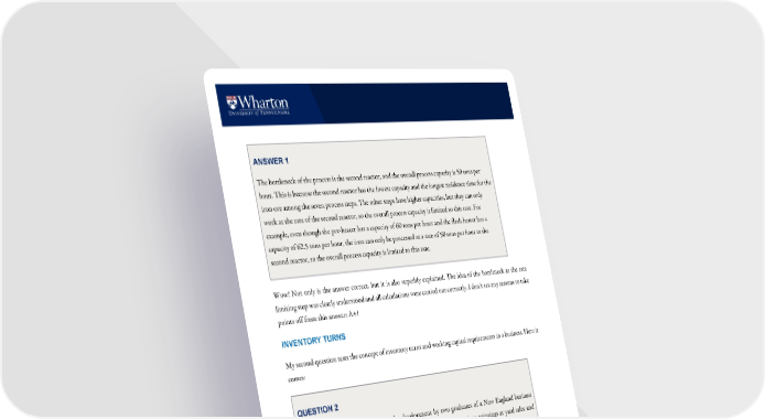 5 ANSWER 1 The bottleneck of the process is the second reactor, and the overall process capacity is 50 tons per hour. This is because the second reactor has the lowest capacity and the longest residence time for the iron ore among the seven process steps. The other steps have higher capacities, but they can only work at the rate of the second reactor, so the overall process capacity is limited to this rate. For example, even though the pre- heater has a capacity of 60 tons per hour and the fla sh heater has a capacity of 62.5 tons per hour, the iron can only be processed at a rate of 50 tons per hour in the second reactor, so the overall process capacity is limited to this rate. Wow! Not only is the answer correct, but it is also superbly expl ained. The idea of the bottleneck as the rate limiting step was clearly understood and all calculations were carried out correctly. I don’t see any reasons to take points off from this answer: A+! INVENTORY TURNS My second question tests the concept of inv entory turns and working capital requirements in a business. Here it comes: QUESTION 2 World -Antique is a new venture under development by two graduates of a New England business school. The value proposition of the venture is simple: purchase antique paintings at yard sales and auctions and then sell them at quadruple the purchase price via a simple eCommerce site (i.e., a painting that is purchased for $100 would be sold at $400). Based on an analysis of similar retailers, the founders expect to turn their inventory 1.5 times per year. To achieve an annual revenue of $3,000,000, how much inventory expressed in $’s should the founders expect their operation to require?