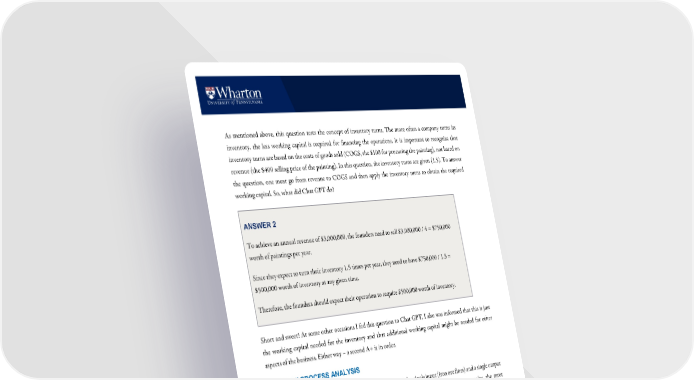 6 As mentioned above, this question tests the concept of inventory turns. The m ore often a company turns its inventory, the less working capital is required for financ ing the operations. It is important to recognize that inventory turns are based on the costs of goods sold (COGS, the $100 for procuring the painting), not based on reve nue (t he $400 selling price of the painting). In this que st ion, the inventory turns are given (1.5). To answer t he question, one must go from revenue to CO GS and t hen app ly t he inventory turns to obtain the required working capital. So, what did Chat GPT do? ANSWER 2 To achieve an annual revenue of $3,000,000, the founders need to sell $3,000,000 / 4 = $750,000 worth of paintings per year. Since they expect to turn their inventory 1.5 times per year, they need to have $750,000 / 1.5 = $500,000 worth of invent ory at any given time. Therefore, the founders should expect their operation to require $500,000 worth of inventory. Sh ort and sweet! At some other occasions I fed this question to Chat GPT , I also was informed that this is just the working capital needed for the inventory and that a dditi ona l wo rking capital might be needed for other aspect s of the business. Either way – a second A+ is in order. COMPLEX PROCESS ANALYSIS The first question (the Circored proc ess) involved a process with a single input (iron ore fines) and a single output (briquets). Many processes, however, involve multiple flows. In the busine ss sc hool community, the most commonly used example of teaching such flow problem s with a product mix is the Harvard Business Sc hool case study “N at io nal Cranberry” (Miller and Olsen 1974). I simplified the 11 -page case study to the following :