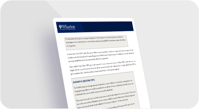 14 To determine the long - run average waiting time in this scenario, we need to use more advanced techniques such as simulation or a more advanced queuing model that takes into account the effects of congestion. It looks like Chat GPT made the correct link to queueing theory. How ev er, i t got stuck when trying to fit the numbers into the formula and eventually gave up with the answer by point ing to “sim ulation or a more advanced queuing model that takes into account the effects of congestion”. H ow could I help Chat GPT get to the answer? A ve ry conv enient feature of Chat GPT is that the user can simply ask for a second answer whenever she i s not co nvinced of the solution. So, I simply asked C hat GPT to give it another shot. And, it wo rked, at least almost! Here is the s eco nd resp onse. ANSWER 6 (SECON D TRY) To find the long run average amount of time that a voter will have to wait before casting their vote using queuing analysis, we need to consider the arrival rate of voters at the kiosk and the service rate of the kiosk (the rate at w hich voters are served by the kiosk). The arrival rate is the rate at which voters arrive at the kiosk, which is 10 voters per hour. The service rate is the rate at which the kiosk can serve voters, which is equal to the inverse of the average time that a voter spends at the kiosk, which is 1/5 voters per minute = 12 voters per hour. The long run average number of voters in the system (waiting and being served) is given by the formula: L = lambda / (mu - lambda) where lambda is the arrival rate and mu is the service rate. Plugging in the values, we get: L = 10 voters per hour / (12 voters per hour - 10 voters per hour) = 10/2 = 5 voters