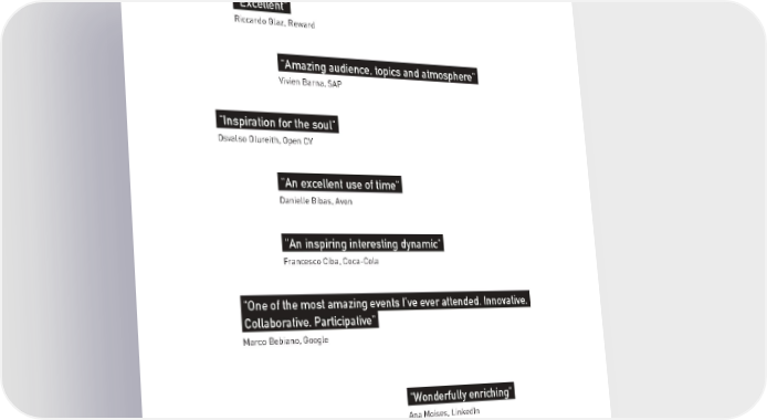 "Excellent". Riccardo Glaz, Reward "Amazing audience, topics and atmosphere". Vivien Barna, SAP "Inspiration for the soul". Osvalso Olureith, Open CV "An excellent use of time". Danielle Bibas, Avon "An inspiring interesting dynamic". Francesco Ciba, Coca-Cola "One of the most amazing events I’ve ever attended. Innovative.. Collaborative. Participative". Marco Bebiano, Google "Wonderfully enriching". Ana Moises, LinkedIn 29