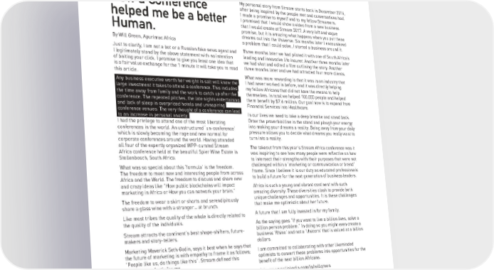 My personal story from Stream starts back in December 2016, How a Conference after being inspired by the people met and conversations had. I made a promise to myself and to my fellow Streamers. helped me be a better I promised that I would show a video from a new business that I would create at Stream 2017. A very loft and vague Human. promise, but it is amazing what happens when you put these dreams out into the Universe. Six months later I encountered By Will Green, Apurimac Africa a problem that I could solve, I started a business around it. Just to clarify, I am not a bot or a Russian fake news agent and Three months later we had piloted it with one of South Africa’s I legitimately stand by the above statement with no intention leading and innovative life insurer. Another three months later of baiting your click. I promise to give you least one idea that we had shot and edited a film outlining the story. Another is a fair value exchange for the 1 minute it will take you to read three months later and we had attracted four more clients. this article. What was more rewarding is that it was in an industry that Any business executive worth her weight in salt will know the. I had never worked in before, and it was directly helping large investment it takes to attend a conference. This includes. my fellow Africans that did not have the means to help the time away from family and the work to catch up after the. themselves. In total we helped 100,000 people and helped conference. The repeated pitches, the late nights entertaining. them benefit by $7.6 million. Our goal now is to expand from and lack of sleep in overpriced hotels and uninspiring. Financial Services into Healthcare. conference venues. The very thought of a conference can lead. In our lives we need to take a deep breathe and stand back. to an increase in personal anxiety.. Draw the proverbial line in the stand and plough your energy I had the privilege to attend one of the most liberating into making your dreams a reality. Being away from your daily conferences in the world. An unstructured ‘un-conference’ pressure allows you to decide what dreams you really want to which is slowly becoming the rage and new normal for turn into a reality. corporate conferences around the world. Having attended all four of the expertly organized WPP-curated Stream The takeout from this year's Stream Africa conference was it Africa conference held at the beautiful Spier Wine Estate in was inspiring to see how many people were reflective on how Stellenbosch, South Africa. to intersect their strengths with their purposes that were not What was so special about this ‘formula’ is the freedom. challenged within a ‘marketing or communication or brand’ The freedom to meet new and interesting people from across frame. Since I believe it is our duty as educated professionals Africa and the World. The freedom to discuss and share new to build a future for the next generation of business leaders. and crazy ideas like "How public blockchains will impact Africa is such a young and vibrant continent with such marketing in Africa or How you can network your brain." amazing diversity. These diversities clash to provide both The freedom to wear a skirt or shorts and serendipitously unique challenges and opportunities. It is these challenges share a glass wine with a stranger… at brunch. that make me optimistic about her future. Like most tribes the quality of the whole is directly related to A future that I am fully invested in for my family. the quality of the individuals. As the saying goes "If you want to live a billion lives, solve a Stream attracts the continent's best shape-shifters, future- billion person problem." In doing so you might even create a makers and story-tellers. business ‘Rhino’ and not a ‘Unicorn’ that is valued at a billion dollars. Marketing Maverick Seth Godin, says it best when he says that I am committed to collaborating with other likeminded the future of marketing is with empathy to frame it as follows; optimists to convert these problems into opportunities for the "People like us, do things like this". Stream defined this benefit of the next billion Africans. definition perfectly for me. Join me www.linkedin.com/in/willgreen 53